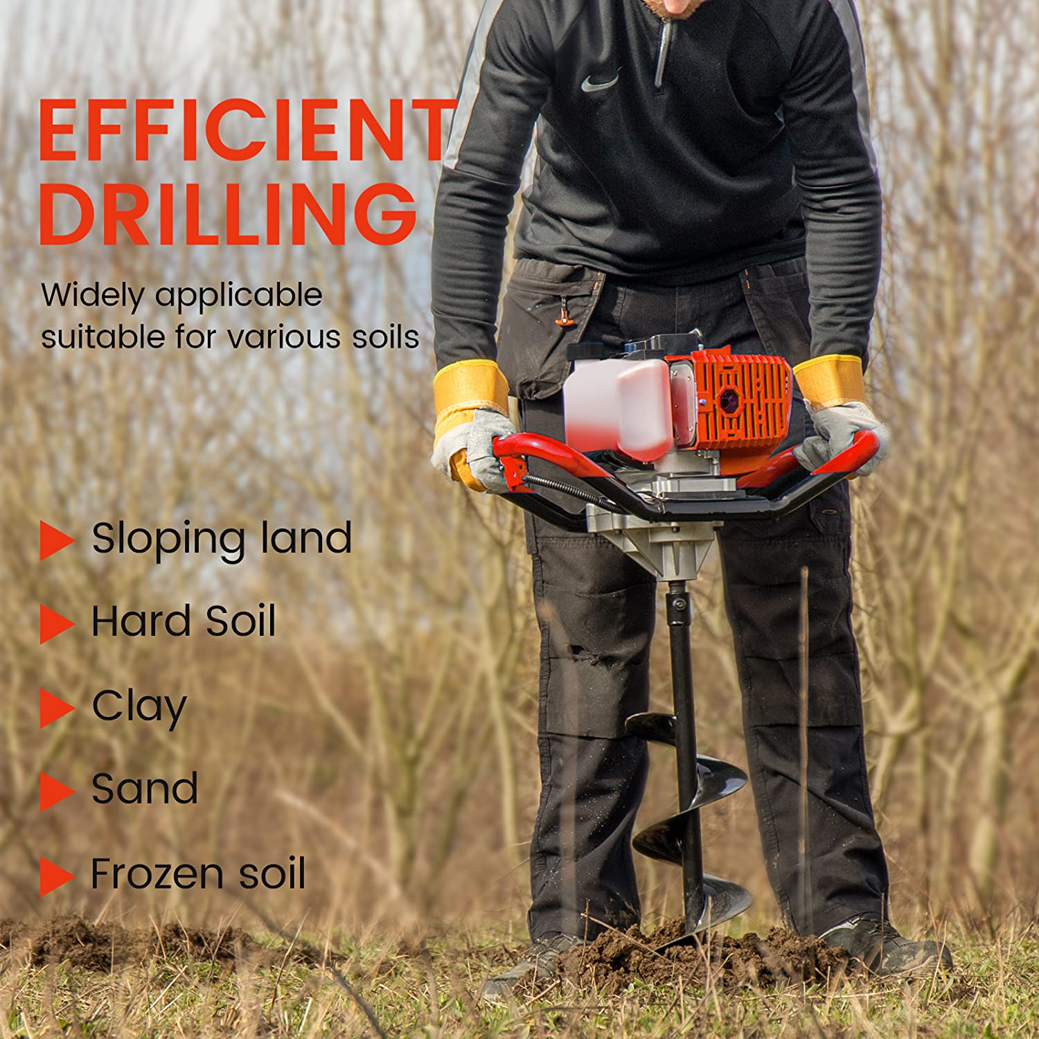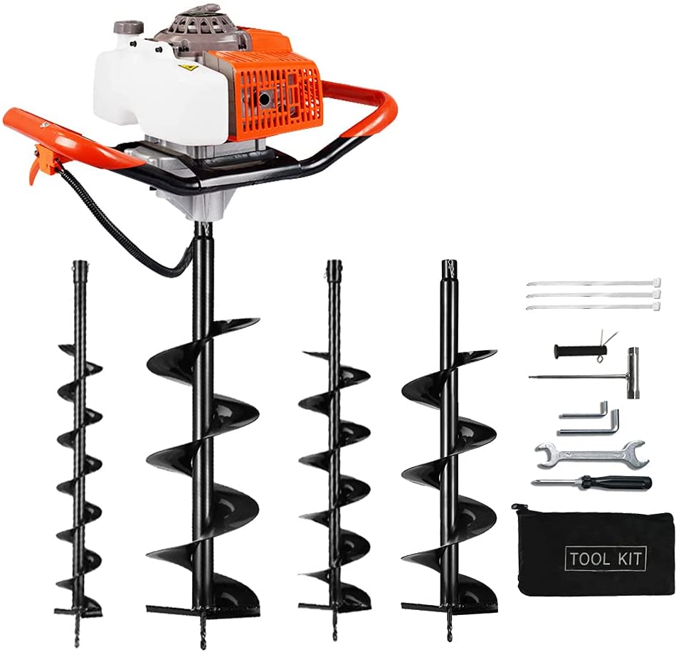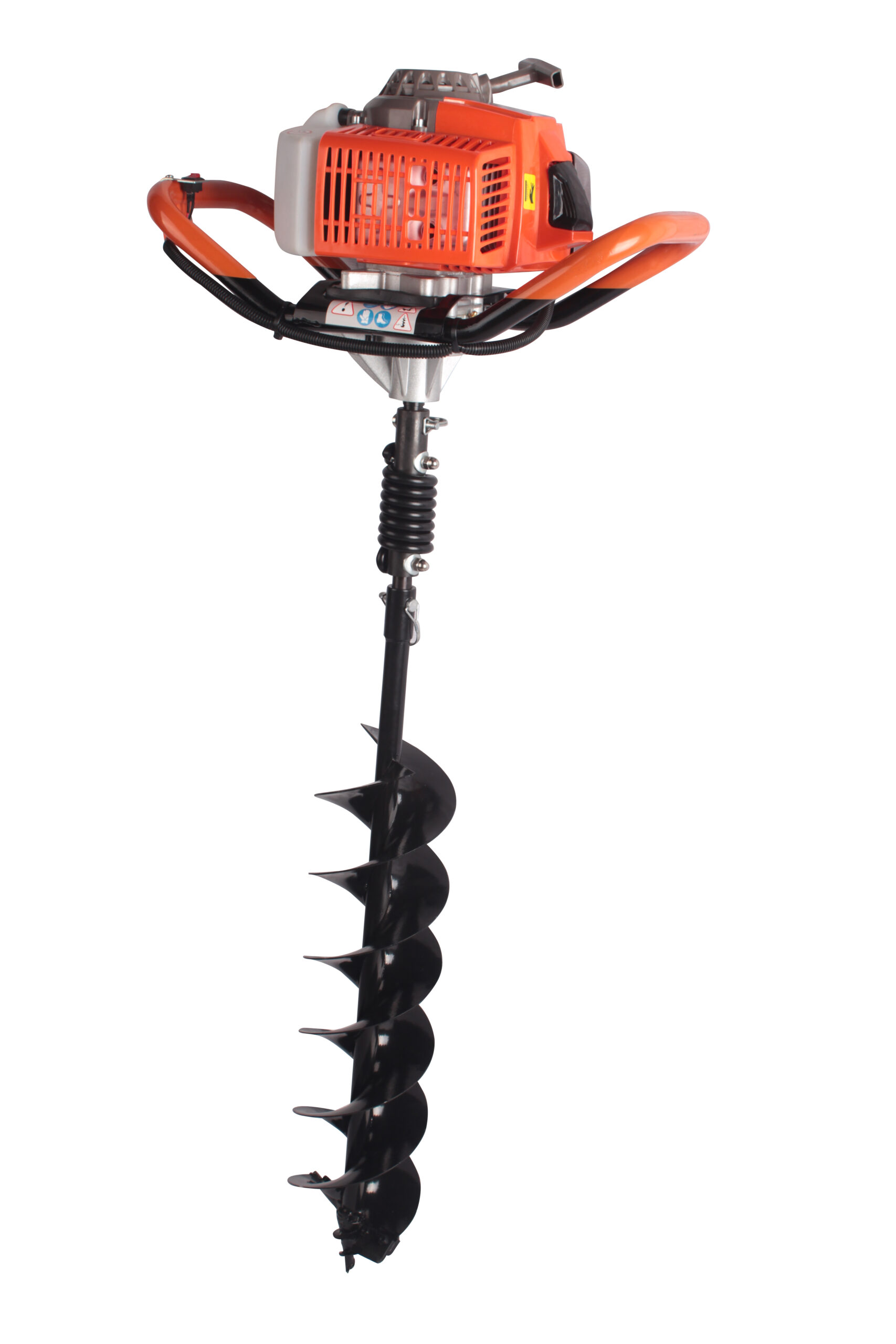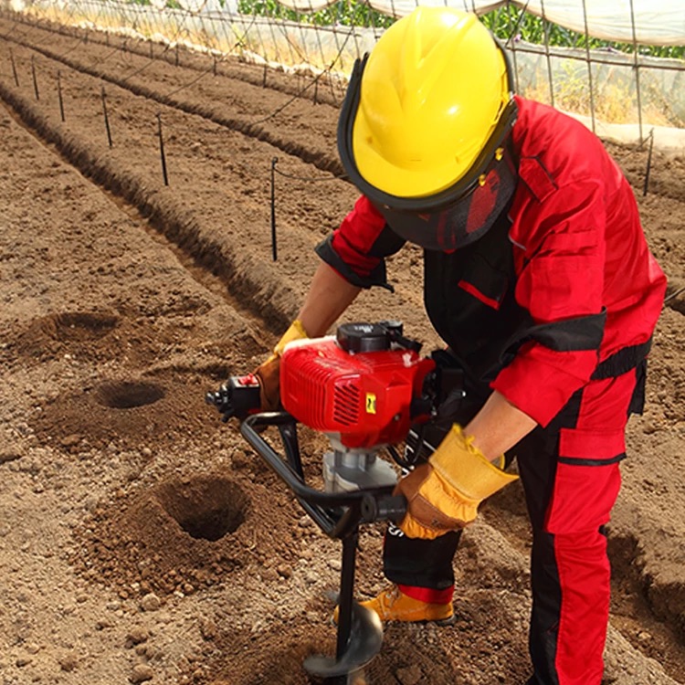 An earth auger hole driller is a portable machine used to drill holes quickly into the ground. It is powered by a petrol engine and uses a rotating spiral bit to dig soil efficiently, making it ideal for farming, fencing, and construction work.